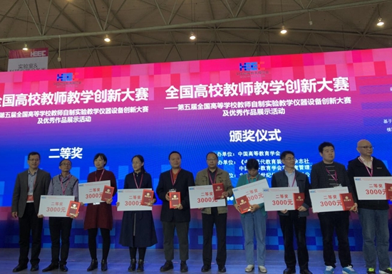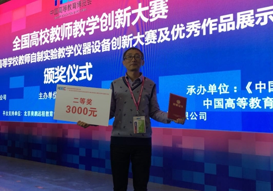 高等学校自制实验教学仪器设备评选活动由中国高等教育学会、教育部高等学校实验室建设指导委员会联合主办,每两年举办一次。此次评选活动于6月启动,共评审出249件作品获得决赛入围资格。范剑老师的作品成功入围决赛并进行现场展示,在决赛中专家对范剑教师作品给予高度评价,最终排名第14名,荣获大赛二等奖(前12名为一等奖)。