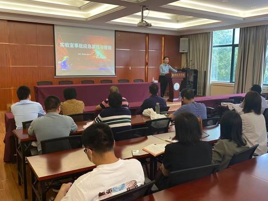本次演练由现场培训会和应急处置两个部分组成。培训会上,无锡赛弗安全装备有限公司安全工程师针对化学品安全知识进行了专题报告。报告强调,面对安全事故采取积极、正确的应对方式是保障实验室安全的有效方式之一。