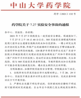 2021年7月27日,中山大学药学院实验室一名博士生用水冲洗此前毕业生遗留在烧瓶内未知白色固体时,被烧瓶炸裂的玻璃碎片刺穿手臂动脉。