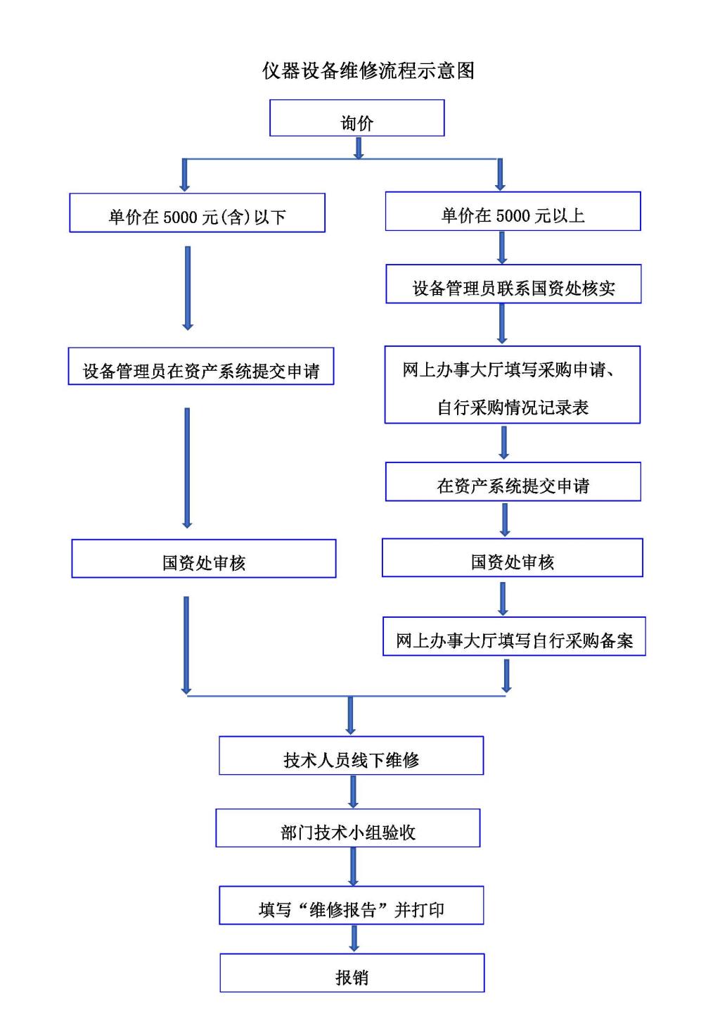 设备管理员在资产系统提交申请——国资处审核——技术人员线下维修——部门技术小组验收——设备管理员填写“维修报告”并打印——报销(报价单、合同、发票、维修报告)